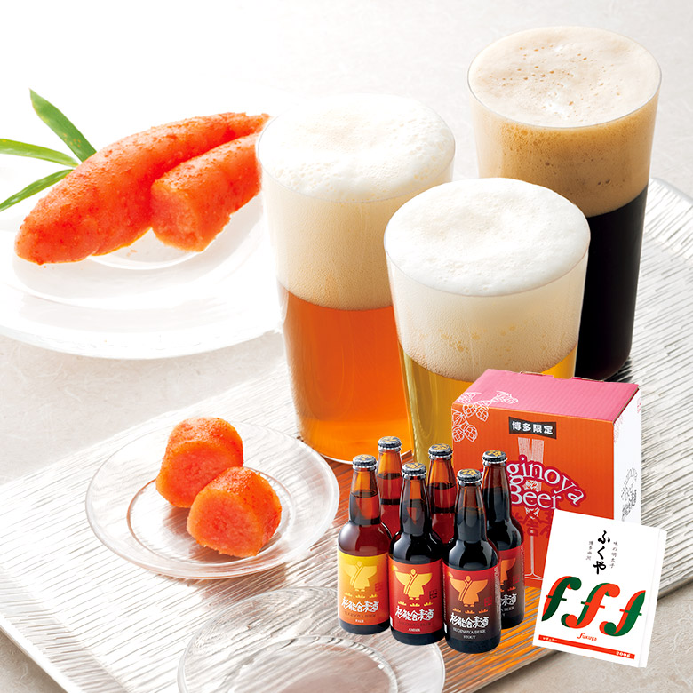 華やかな香りと芳醇な味わいの「博多の地ビール」とふくや自慢の「味の明太子」のセットです。