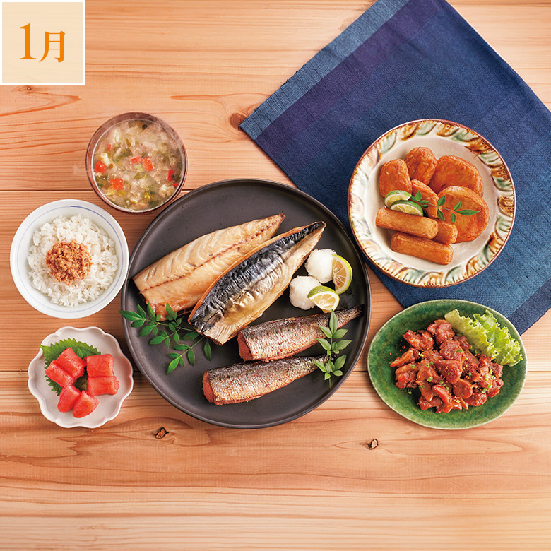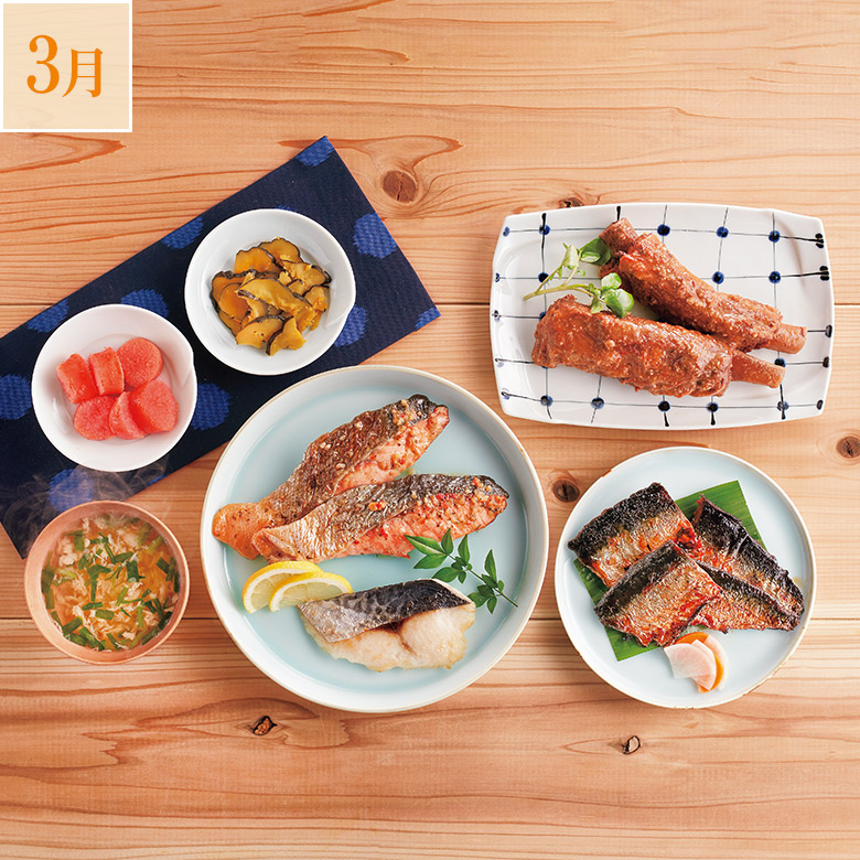 | 【主原料/原産地】 | ◆家庭用明太子無着色マイルド:すけとうだらの卵/ロシア又は米国 ◆焼いわし明太:いわし/日本 ◆進藤商店 塩さば:さば/ノルウェー ◆味の明太粉鶏炭火焼 ぴりりでじりじり: ・味の明太粉鶏炭火焼:鶏肉/国産 ・味の明太粉:食塩/国内製造 ◆ごはんとまらんらん とりそぼろ明太:鶏肉/日本 ◆さつまあげ3種:魚肉:アメリカ・日本 他 ◆ツルみそ 豚汁柳川膳 :豚肉/輸入 |