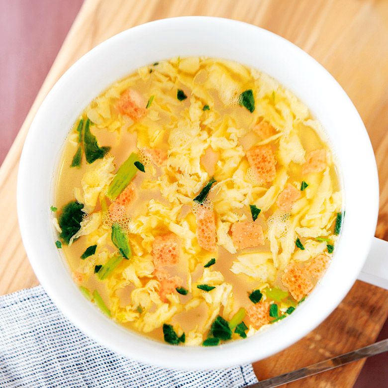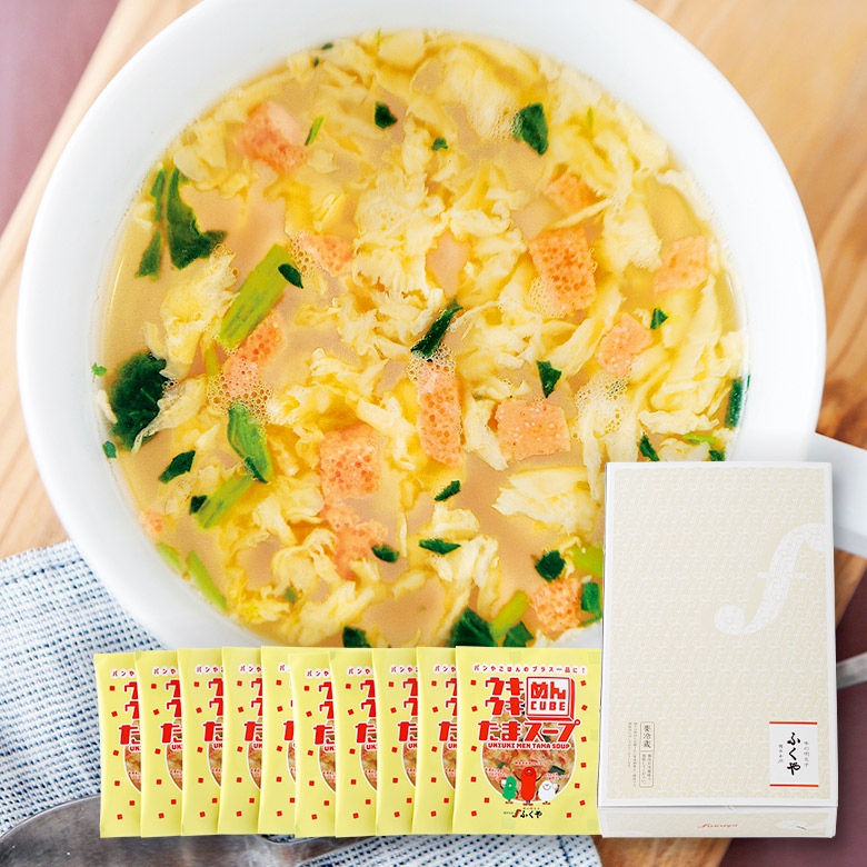液体に浮くフリーズドライ明太子と、美味しい食事を前にワクワクする気持ちを掛け合わせ、『ウキウキめんたまスープ』と名付けました。