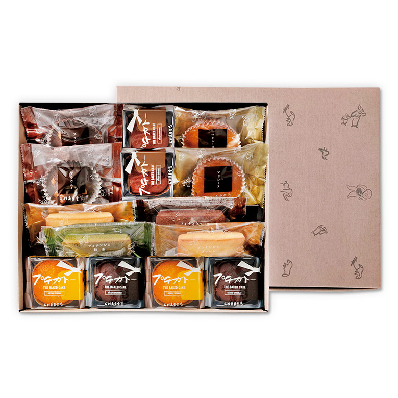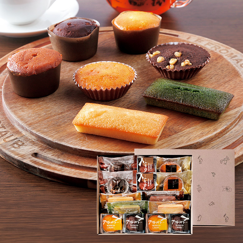| 【内容量】 | ガトーショコラ2個、ガトーフロマージュ2個、ガトーキャラメル2個、マドレーヌ2個、ブラウニー2個、フィナンシェ(プレーン)2個、フィナンシェ(ショコラ)1個、フィナンシェ(抹茶)1個 |