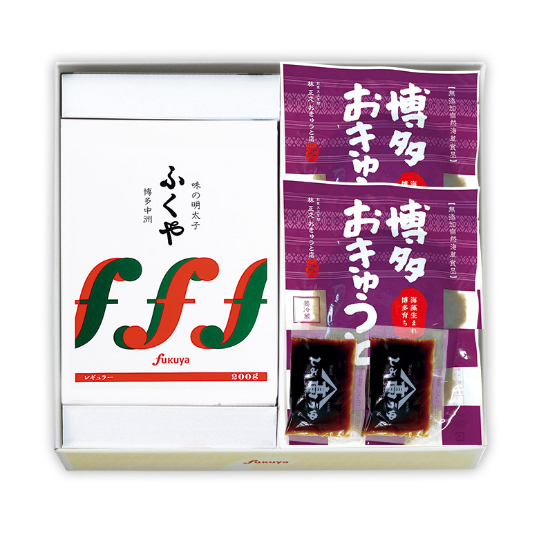 | 【内容量】 | ◆味の明太子〈レギュラー〉:200g ◆博多おきゅうと: 【おきゅうと】5枚(175g)×2袋 【おきゅうとしょうゆ】30g×2袋 |