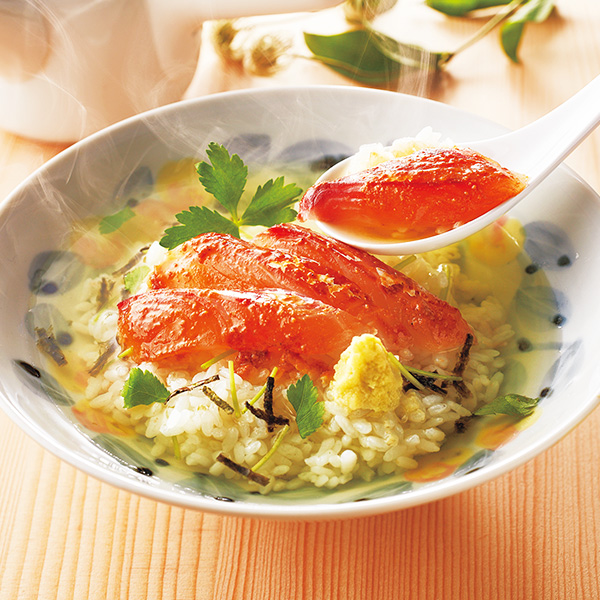 ③②で漬け込んだ切身とたれをそのまま温かいご飯の上にのせ、熱い緑茶をかけたら鯛茶漬けの出来上がりです。