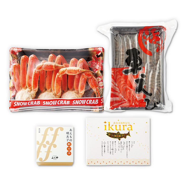 | 【内容量】 | ◆数の子明太子:110g ◆ズワイガニ3肩2L:3肩(750g) ◆活〆冷凍車えび:300g(14~17尾) ◆いくら醤油漬:250g |