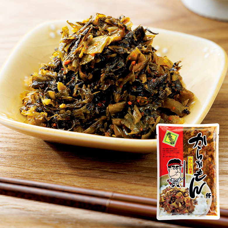 | 【原材料】 | 高菜漬け(高菜、食塩)、食用植物油脂、唐辛子、陳皮、ガーリックパウダー、醤油、ジンジャーパウダー /調味料(アミノ酸等)、pH調整剤、ウコン色素、(一部に小麦・大豆・ごまを含む) |