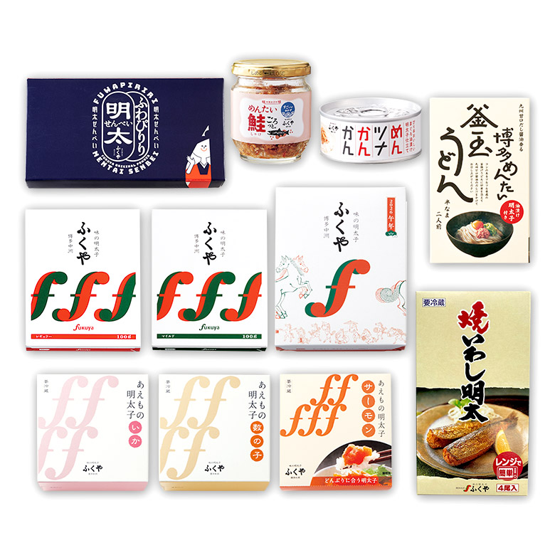 | 【内容量】 | ◆開運うまく行く味の明太子:200g ◆味の明太子〈レギュラー〉:100g ◆味の明太子〈マイルド〉:100g ◆いか明太子:110g ◆数の子明太子:110g ◆サーモン明太子:120g ◆ふわぴりり明太せんべい:20枚(2枚入×10袋) ◆博多めんたい釜玉うどん:2人前(めん 120g×2、つゆ 15g×2、辛子明太子油漬け 12g×2、刻のり 0.2g×2、乾燥ねぎ 0.15g×2) ◆めんたい鮭ごろっと。:85g ◆焼いわし明太 4尾:4尾 ◆めんツナかんかん:90g |