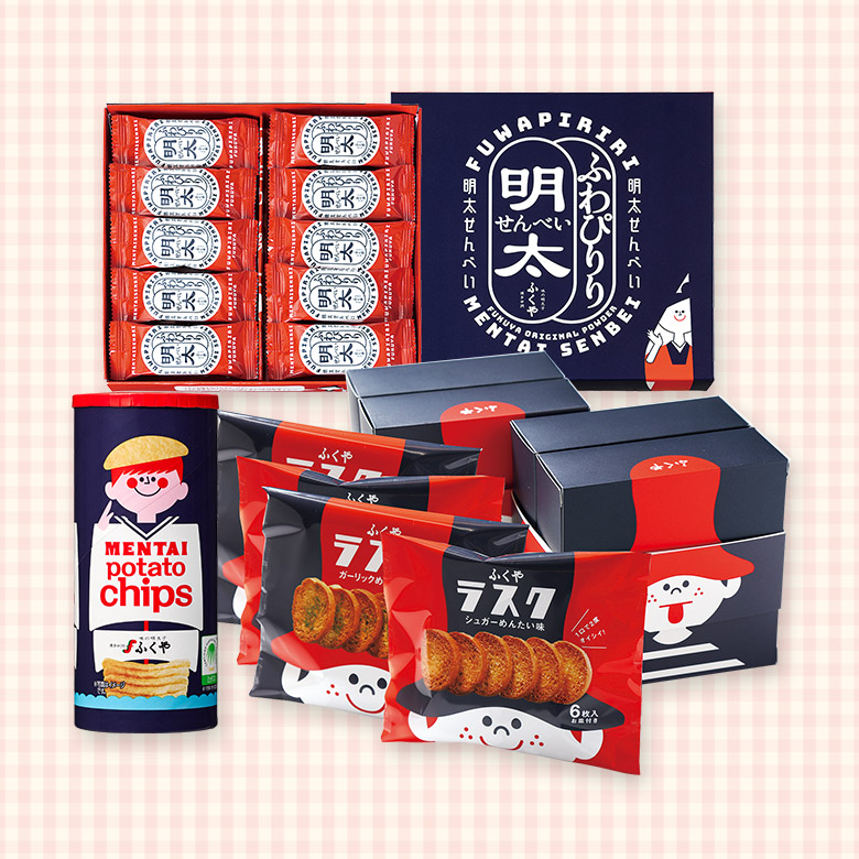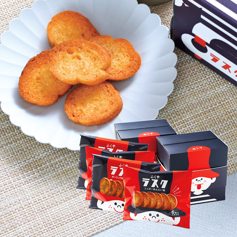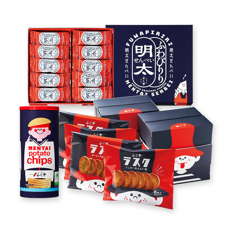 | 【内容量】 | ◆ふくやラスク めんたい味2箱セット:24枚(1箱12枚(シュガーめんたい味6枚・ガーリックめんたい味6枚)×2) ◆めんたいポテトチップス:45g ◆ふわぴりり明太せんべい:40枚(2枚入×20袋) |