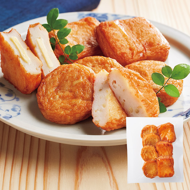 エソをはじめ、スケソウタラ、イトヨリダイなどを中心に 食味や食感がいちばん良い配合ですり身にし、鹿児島の地酒をたっぷり加えて独特の風味や色合いに仕上げています。 ごぼう入りは、千切りの生ごぼうの風味が活きた昔ながらの定番さつま揚げの一つです。チーズ入りは、温めて食べるのがオススメです。チーズのコクが口に広がります。