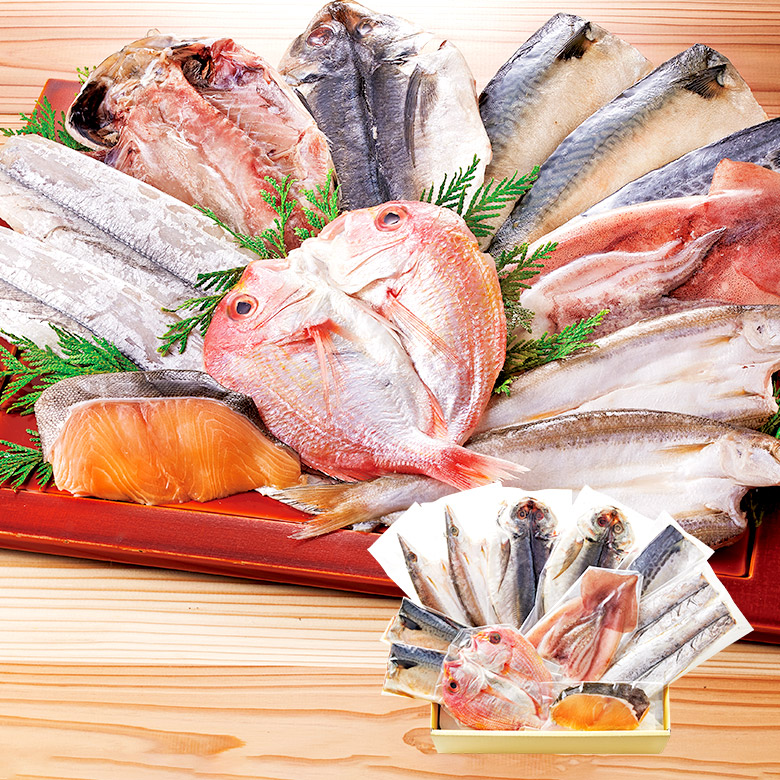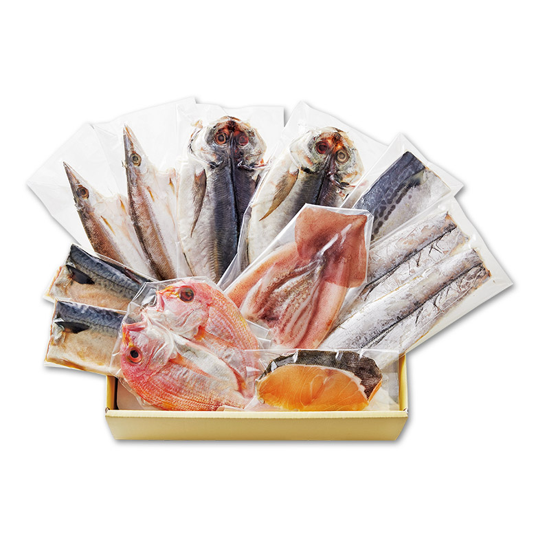 | 【内容量】 | かます2枚、太刀魚2枚、連子鯛1枚、さわら1枚、真あじ2枚、するめいか1枚、さばみりん2枚、銀だらみりん1枚 |