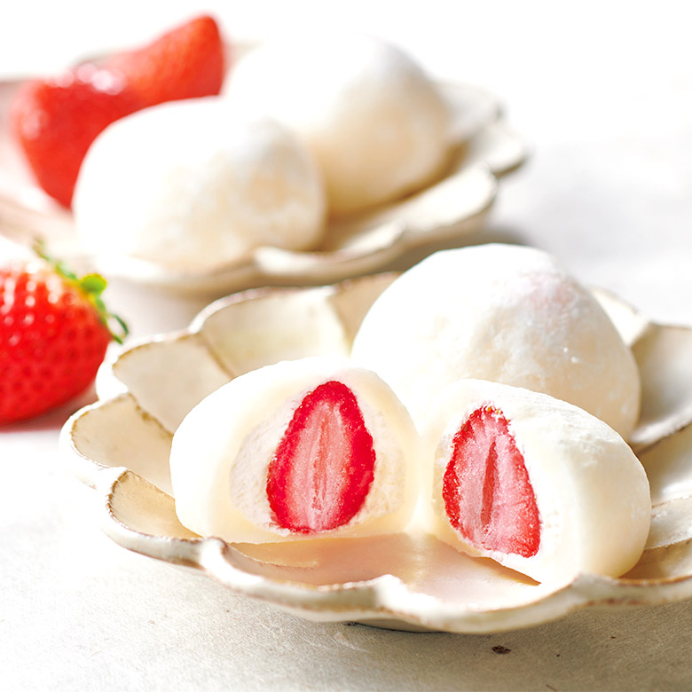 やわらかいお餅の食感といちごの酸味、やさしい甘さのクリームが1つになった味わいのバランスをお楽しみください。