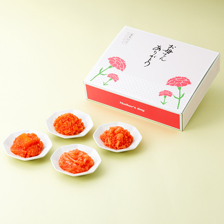 | 【内容量】 | ◆数の子明太子:110g ◆くらげ明太子:110g ◆いか明太子:110g ◆ほたて貝柱明太子:110g |