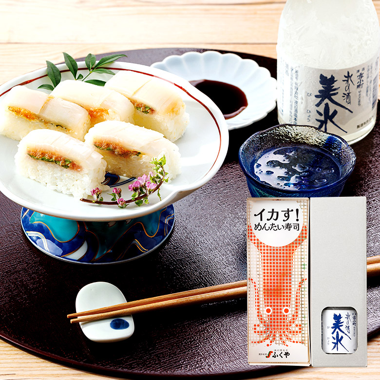 | 【内容量】 | ◆イカす! めんたい寿司:【寿司】240g 【添付たれ】10g ◆雪小町 氷の酒 美氷:300ml◆メッセージカード:ご希望の場合は、「セット商品 3つ目」のタブからお選びください。 |