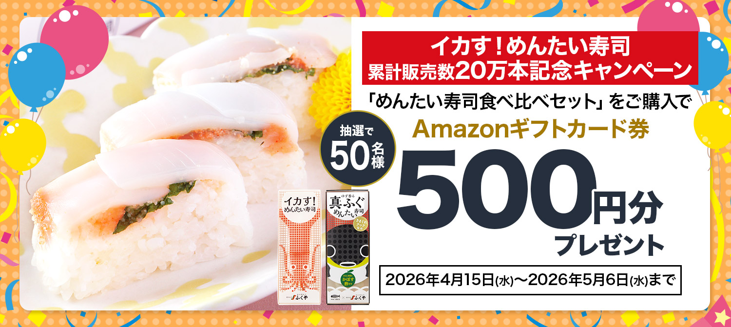 つきましては、「イカす!めんたい寿司」の累計販売数20万本突破を記念し、オンラインストア限定の特別キャンペーンを実施いたします。