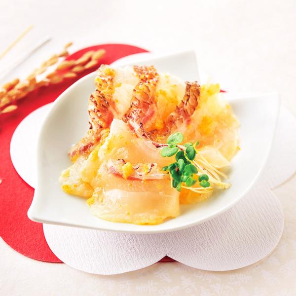 熊本県天草でこだわりを持って育てた天草荒波真鯛を、熊本県産の完熟の柚子を使い、さわやかで風味豊かな柚子〆に仕上げました。