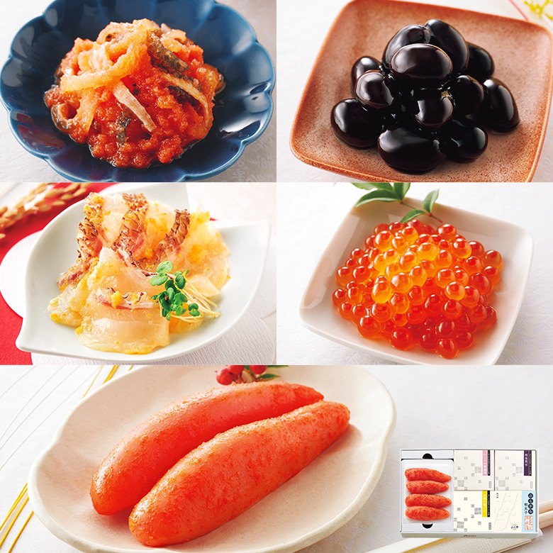 【内容量】 | ◆味の明太子<レギュラー>:200g ◆いくらの醤油漬け:50g(固形量40g) ◆丹波黒豆:200g(固形物100g) ◆ふくかわ明太子:100g ◆真鯛の柚子〆:100g |