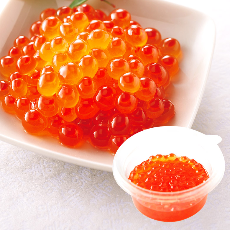 鮮度の良い筋子のみを使用し、独自の調味液に漬け込んだ、味・色・品質にこだわったいくら醤油漬けです。