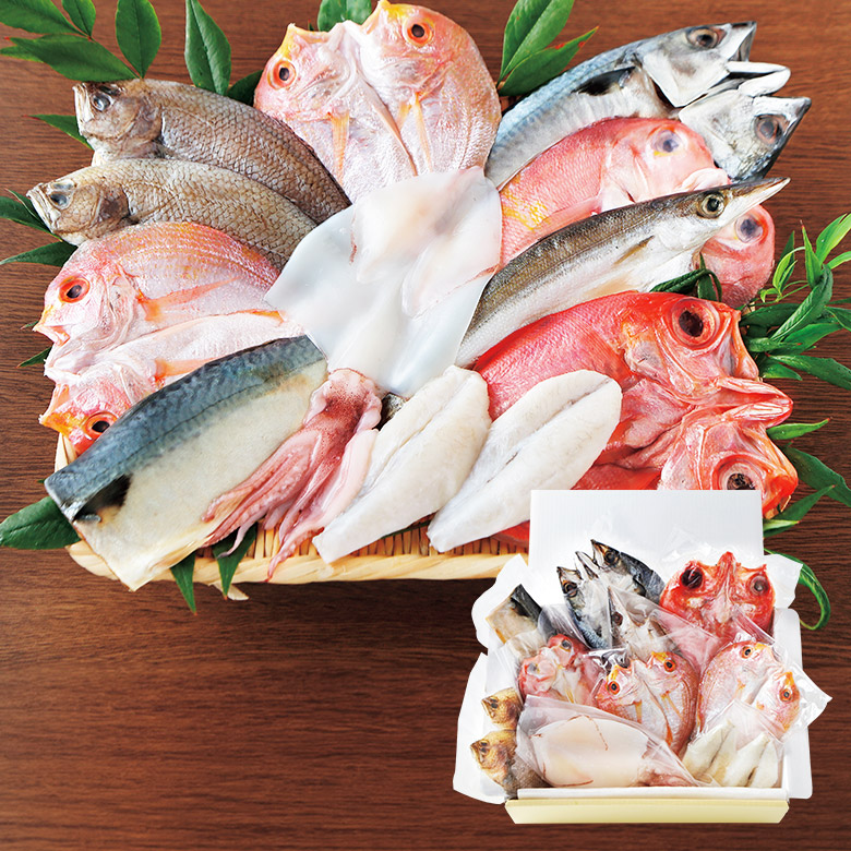 | 【内容量】 | 連子鯛2枚、網カレイ2枚、甘鯛1枚、金目鯛1枚、ショウサイフグ2枚、さばみりん1枚、 ヤリイカ1枚、さば1枚、赤かます1枚 |