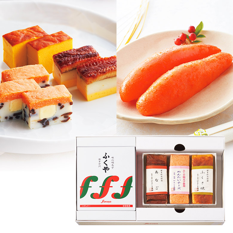 素材の味が活きた人気の「あなご」と「ふくさ焼き」の料理かまぼこ3本セットに、味の明太子をおつけして、お届けします。