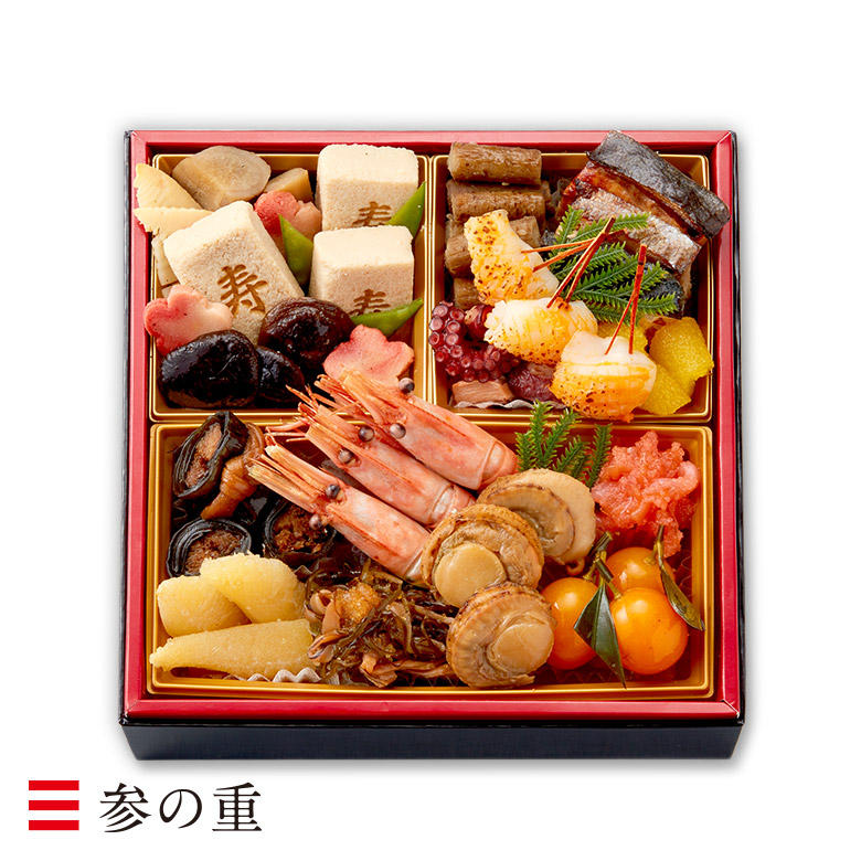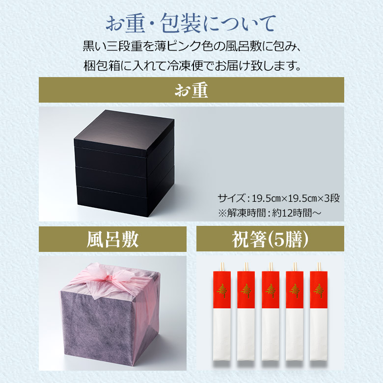 【内容量】 | 三段重 ・51品目 ・祝い箸5膳 |