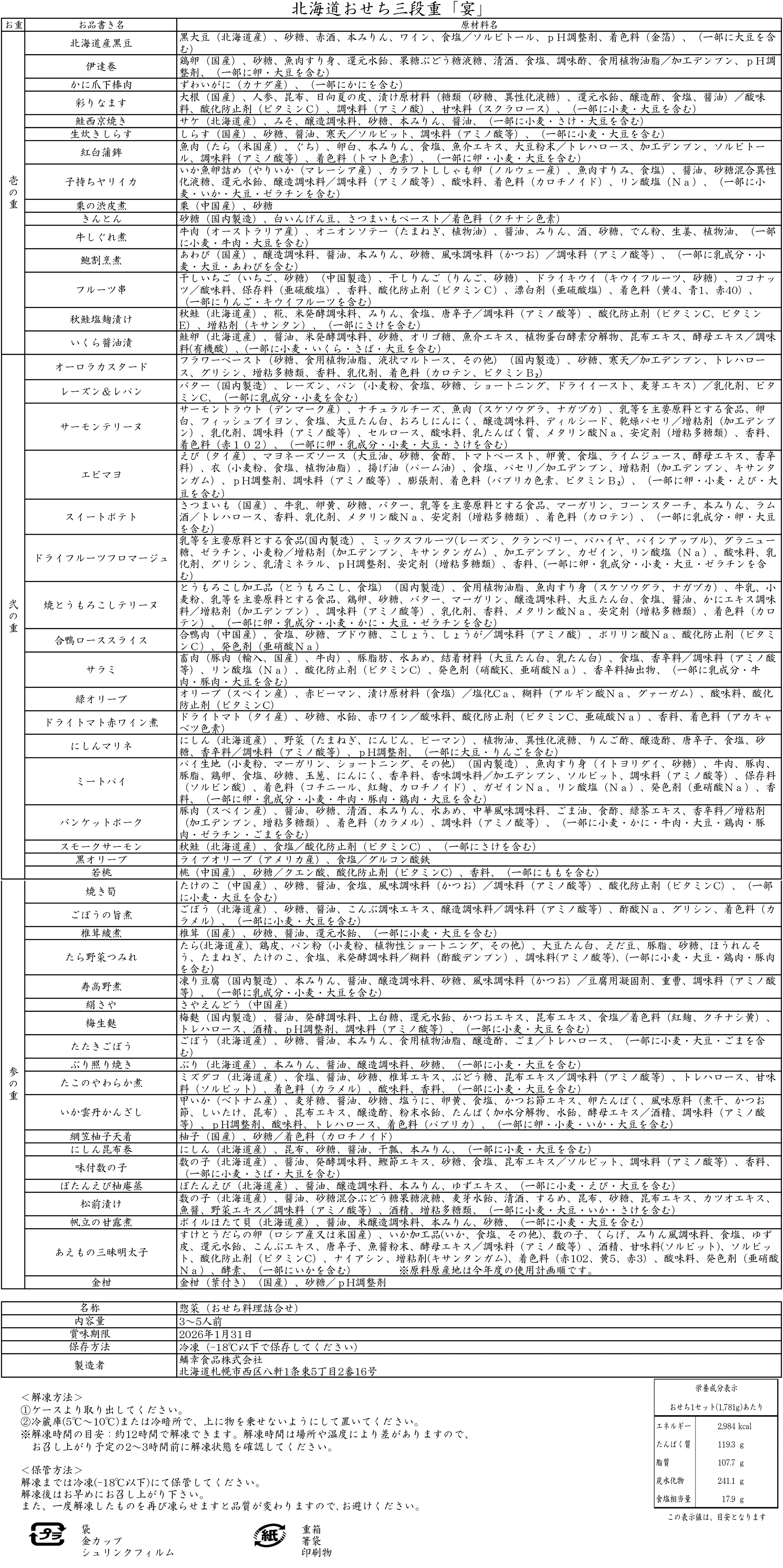 【アレルギー情報】 | 卵、乳、小麦、えび、かに、あわび、いか、いくら、キウイ、牛肉、さけ、さば、大豆、鶏肉、豚肉、もも、りんご、ゼラチン、ごま |