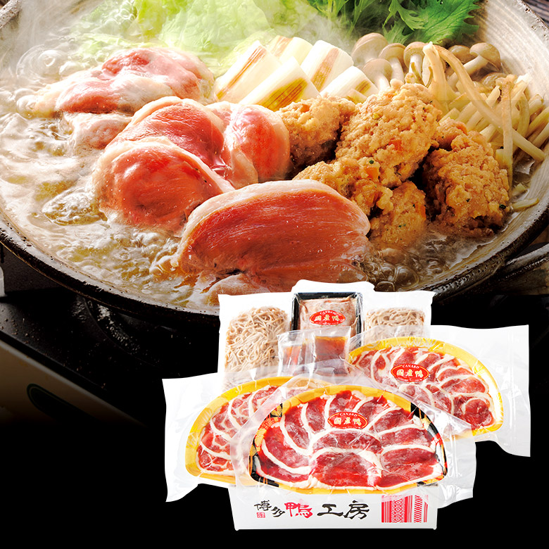 【内容量】 | ◆国産鴨モモスライス340g(170g×2P) ◆国産鴨ローススライス170g×1P ◆冷凍ゆでそば360g(180g×2P) ◆鍋のつゆ150g(25g×6P) ◆国産鴨つみれ200g×1P |
