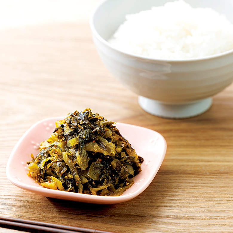 高菜漬にマイルドな辛味と明太子が入った高菜の油炒めです。
