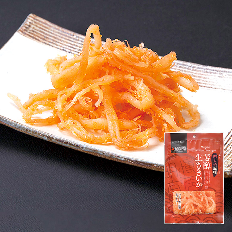 | 【原材料】 | さきいか(いか(ペルー産)、砂糖、乳糖、食塩、醸造酢)、からふとししゃも卵、食塩、魚介エキス、唐辛子、乳糖、いりこだし、辛子明太子シーズニング/ソルビトール、調味料(アミノ酸等)、グリセリン、酸味料、リン酸塩(Na)、香辛料抽出物、保存料(ソルビン酸K)、着色料(赤102)、(一部に乳成分・いか・さばを含む) |