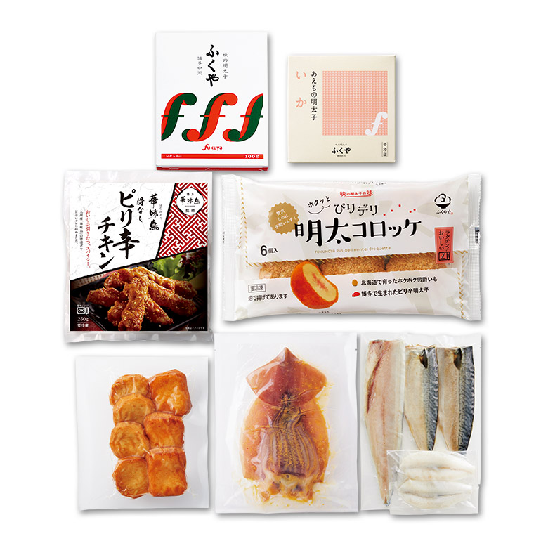 | 【主原料/原産地】 | ◆味の明太子〈レギュラー〉:すけとうだらの卵/ロシア又は米国 ◆いか明太子:いか加工品/国内製造、いか/タイ又はインドネシア又はインド ※原料事情により変更になる可能性があります ◆紫垣商店 するめいか西京漬け:するめいか/長崎県産 ◆紫垣商店 鮮魚一夜干し3種5枚:さわら・ショウサイフグ・さば/長崎 ◆華味鳥 骨なしピリ辛チキン:鶏肉/九州産 ◆ホクッとぴりデリ 明太コロッケ(6個入り):ばれいしょ(北海道) ◆揚立屋さつまあげ(チーズ・ごぼう):魚肉/タイ、マレーシア、アメリカ、ミャンマー、日本等 |