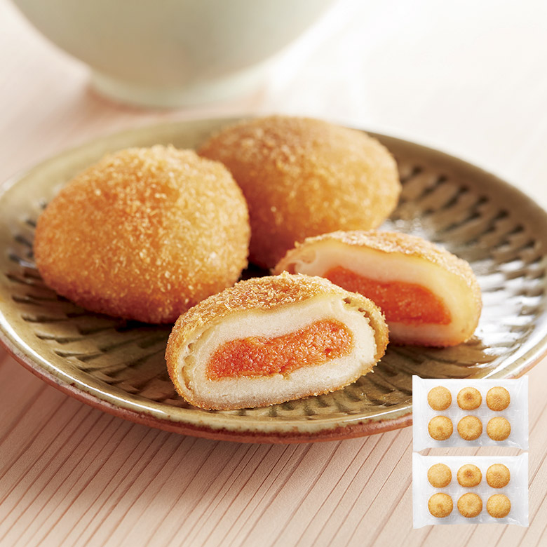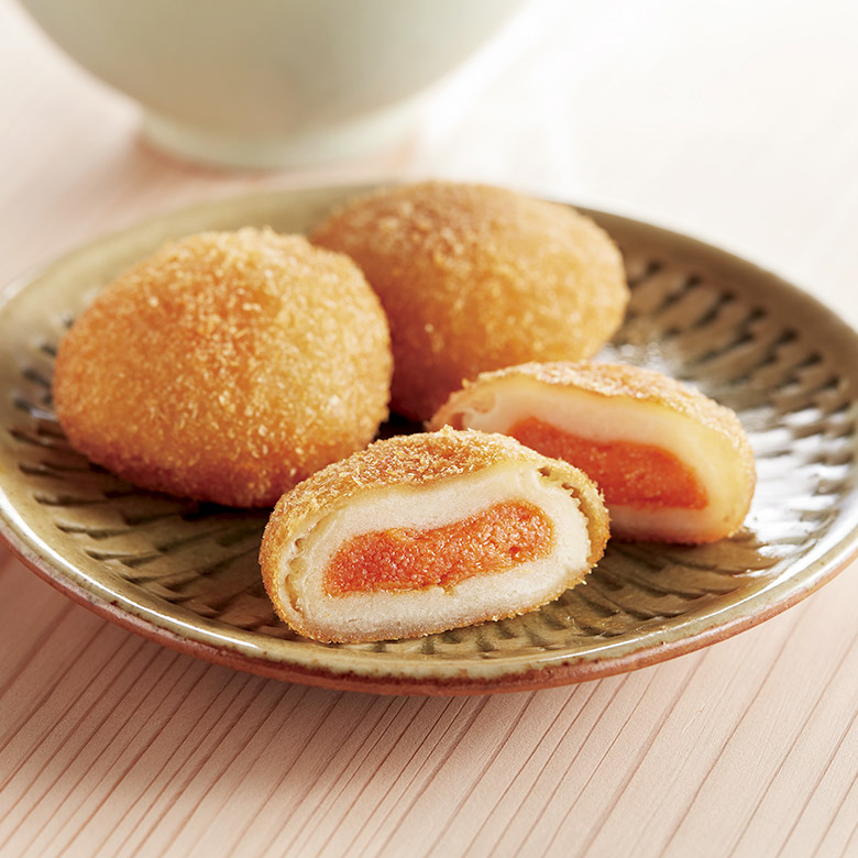 北海道で育ったホクホク男爵いもと博多で生まれたピリ辛明太子で、美味しい「いももち」が出来ました。