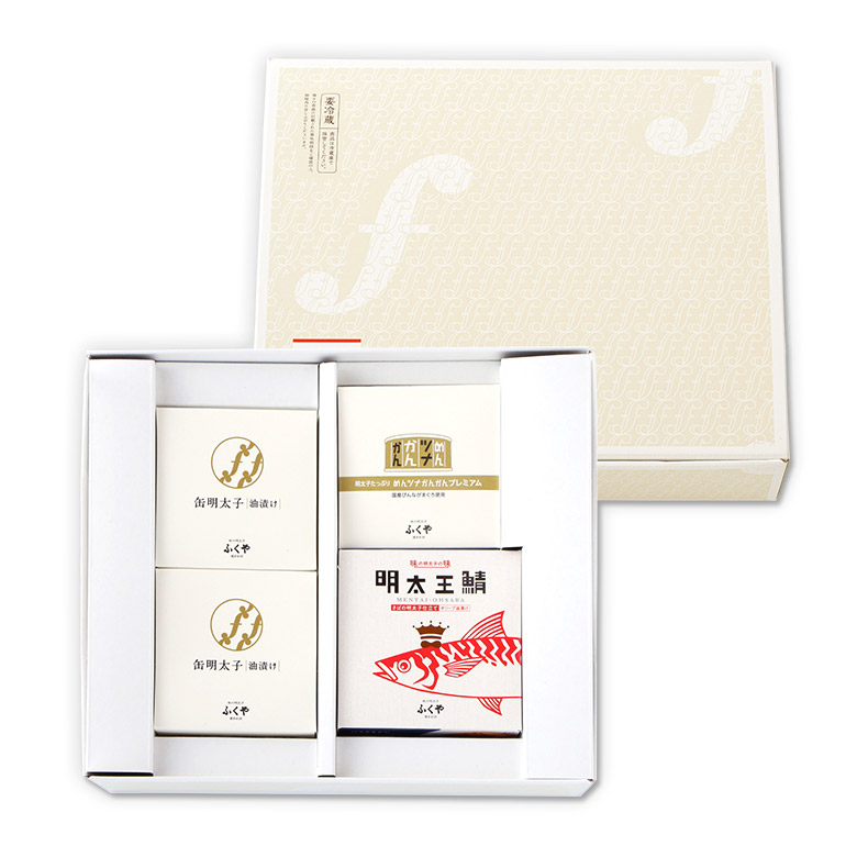 | 【内容量】 | ◆缶明太子・油漬け:85g×2 ◆明太王鯖:内容総量165g(固形量135g) ◆めんツナかんかん プレミアム箱入り:90g |