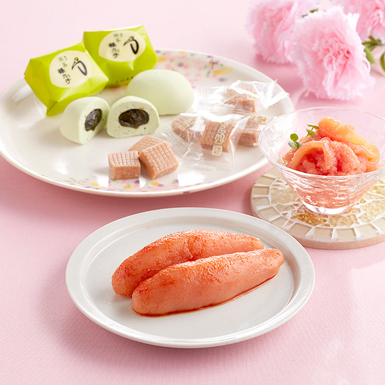 | 【内容量】 | ◆味の明太子〈レギュラー〉:100g ◆いか明太子:100g ◆抹茶鶴乃子:6個 ◆半生キャラメル(あまおう):80g ◆メッセージカード:ご希望の場合は、「セット商品 5つ目」のタブからお選びください。 |
