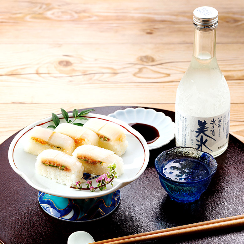 凍らせてシャーベット状で楽しむ日本酒「美氷」と博多名物イカすめんたい寿司のセットです。