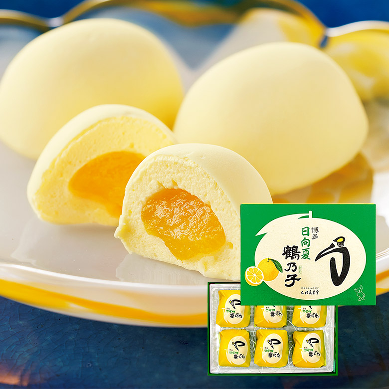 宮崎県産「日向夏」を使用した夏季限定の鶴乃子。 ふんわりやさしいマシュマロ生地で包み込んだ宮崎県産日向夏餡には、日向夏のスライスを贅沢に使用しました。