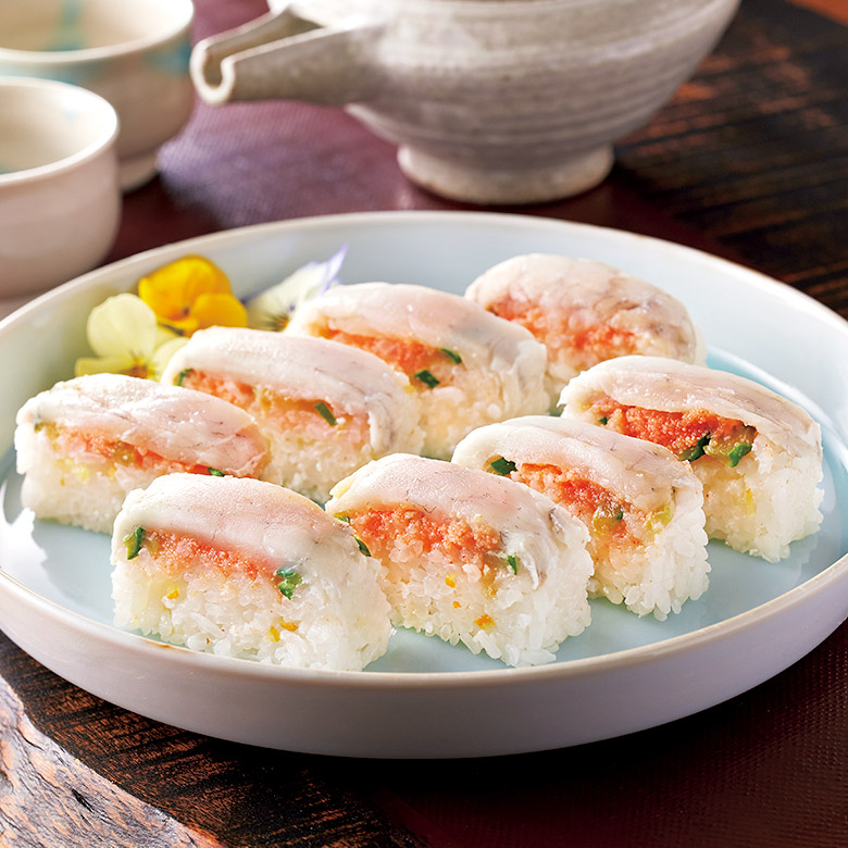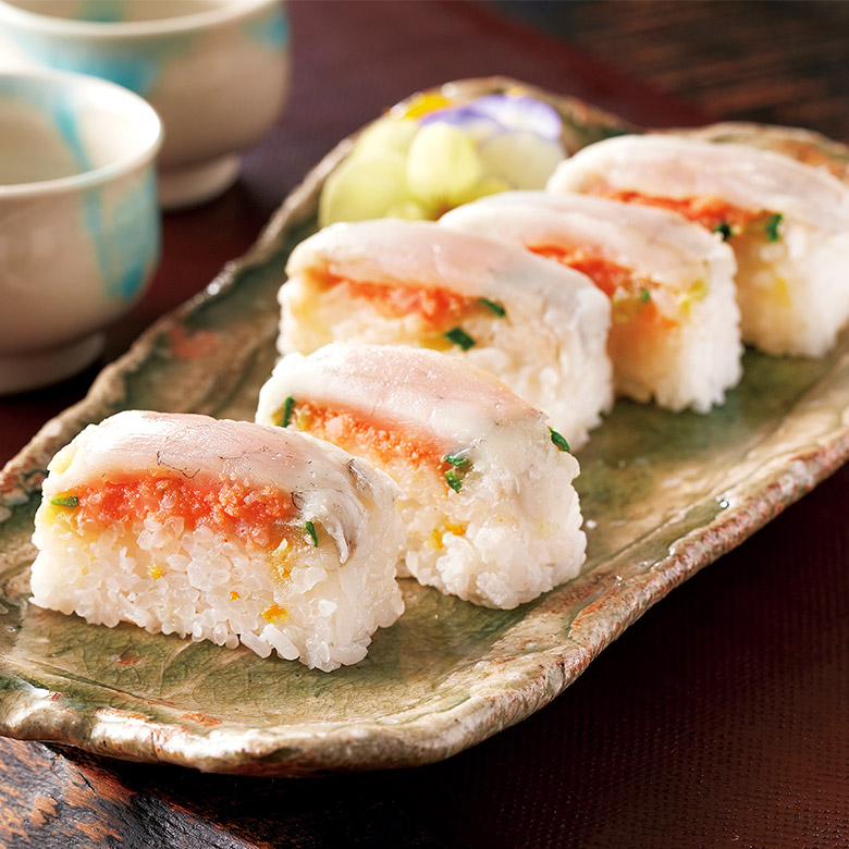 いかと酢飯の相性を考え、新たに開発した粒立ちの良い明太子を使った押し寿司です。