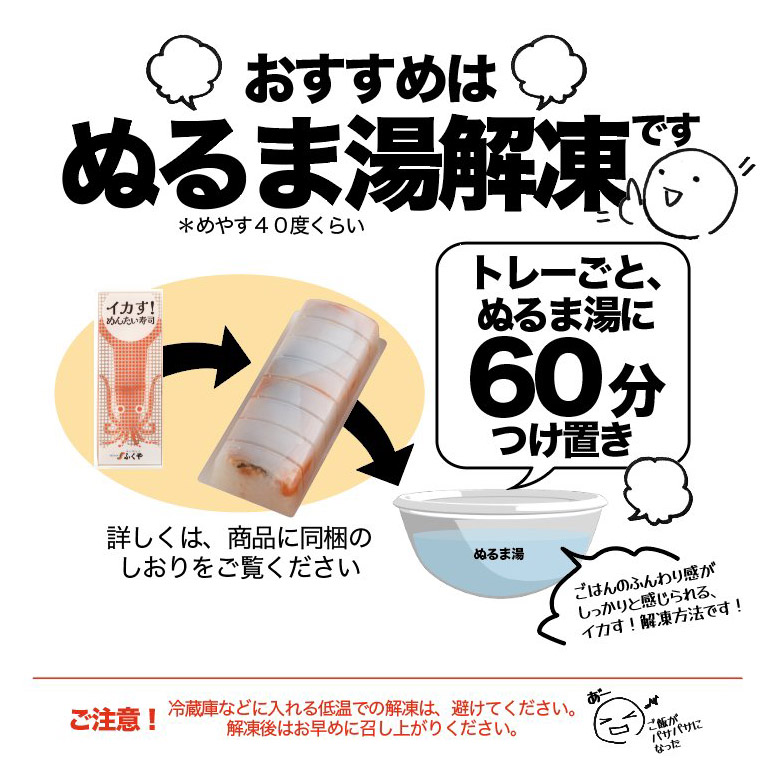 | 【内容量】 | ◆イカす! めんたい寿司:【寿司】240g 【添付たれ】10g ◆真ふぐ めんたい寿司:【寿司】240g 【かぼす酢】5g |
