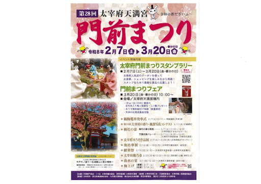 福岡観光で有名な太宰府天満宮の参道にある「太宰府グルメ=明太茶漬け」を食べることができるふくや太宰府店です。 【門前祭り】 福岡県太宰府市の太宰府天満宮で、梅の花が満開を迎える中、春の風物詩『第28回 太宰府天満宮 門前まつり』が2月7日(土)に幕を開けます。初日には、華やかな万葉衣装に身を包んだ参加者による、1300年前の歌会「梅花(ばいか)の宴」の再現とパレード。参道に万葉の世界が繰り広げられます。2月中旬から3月上旬にかけて見頃を迎える約200品種、約6000本の梅の香りに包まれながら、まつりを楽しんでみませんか? (ふくや太宰府店) ■営業時間 9:30~17:30 ■店内飲食10:00~16:30 「福岡土産」もたくさんご用意しております。太宰府天満宮へお越しの際は、是非「ふくや太宰府店」へお立ち寄りくださいませ。