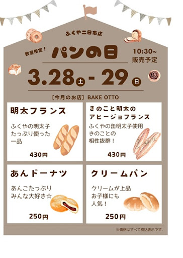 福岡観光で有名な太宰府天満宮からもすぐ近く!車でも最寄り駅から徒歩でも約10分。 ほっと一息つける店「味の明太子ふくや二日市店」です。 今月のパンの日☆彡 3月28日(土)、29日(日) 数量限定で、パンの販売をいたします。 今月のお店は春日市の宝町交差点にある「ふくやとKASUGA」の中にあるベーカリーカフェ 「BAKE OTTO」さんのパンです。 ふくやの明太子を贅沢に使用した ☆明太フランス 430円(税込) 明太フランスの進化系 ☆きのこと明太子のアヒージョフランス 430円(税込) あんこたっぷり ☆あんドーナツ 250円(税込) お子様にも人気! クリームパン 250円(税込) AM10:30頃からの販売予定‼ なくなり次第終了となりますので、お早めにお買い求めくださいませ。 皆様のご来店を心よりお待ちしております。 《ふくや二日市店》 ■営業時間9:00~17:30(※お昼休みなし) ご自宅用やギフト商品もたくさんご用意しております。是非「ふくや二日市店」へお立ち寄りくださいませ。