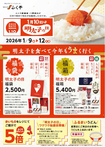 🌸もっと楽しく ごはん時間 🎉”春のごはんのおともフェア”開催!🎉 4月1日から始まるイベントのご紹介です♬ 期間: 2026年4月1日㊌~4月30日㊍ 【企画その1】家族でたっぷり味わう!家庭用明太子10%増量キャンペーン✨ 通常340gのところ、キャンペーン期間中は374gで販売いたします。 【企画その2】ふくやのご飯のお供 "大試食会&ポイントキャンペーン⭐ 「ごはんのおとも!人気ベスト5」の試食会を開催いたします。 対象商品購入を2品購入以上で、お会計のふくやポイントが「2倍・3倍・5倍UP!」 (上限5倍まで) 【企画その3】春のお買い物抽選会!!🌟 期間中、税込3,000円お買い上げで1回抽選、当選者には “「500円分のふくやお買い物券」”をプレゼント🎁 【企画その4】ふくや春のカタログ掲載商品をお持ち帰りできる🚩 <春O'clocca掲載商品のおすすめ詰め合わせ> ① 春のごはん時間彩り箱 ② 明太子と春のスイーツ詰合せ ③ ごはんのおともベスト5詰合せ 「ふくやで大人気!ベスト5」の商品をご準備いたします。 💫などなど楽しいイベントが盛りだくさん!🚩 是非!みなさまのご来店をお待ちしております🏃♂️ ▼詳しくはこちら▼ https://www.fukuya.com/news/shop_spring_festival/ 大試食会はカレンダーをcheck✅