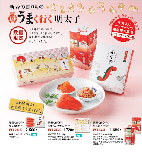 【新春の贈りもの】 12/12~31の期間で 縁起物の9頭の馬をあしらった 限定パッケージ商品を販売いたします。 新春のご挨拶などにぜひご活用ください。 #明太子 #贈りもの