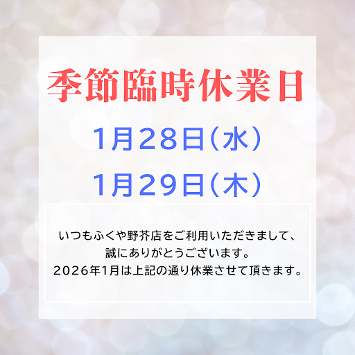 ◆ふくや野芥店 季節臨時休業のお知らせ◆ いつもふくや野芥店をご利用いただき誠にありがとうございます。 下記の日程は季節臨時休業となります。 お客様にはご迷惑おかけしますが、ご理解の程よろしくお願いいたします。 ■季節臨時休業日■ 2026年1月28日(水) 2026年1月29日(木) ふくや長尾店 1月28日(水)は通常営業。1月29日(木)は定休日となります。 ふくや小田部店は通常通り営業しております。 お急ぎのお客様は上記二店舗をご利用くださいませ。