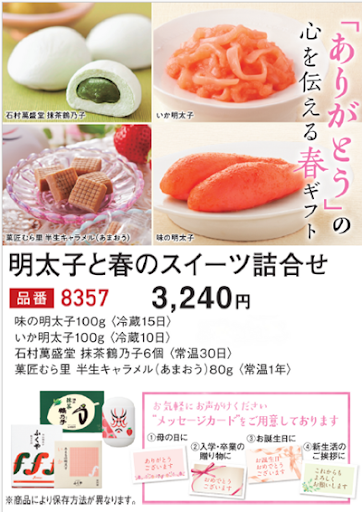 九州自動車道「太宰府」インター近くにあります。 【味の明太子ふくや大野城店】です。 ~明太子と春のスイーツ詰合せ ¥3,240(税込)~ セット内容 味の明太子100g いか明太子100g 石村萬盛堂 抹茶鶴乃子6個 菓匠むら里 半生キャラメル(あまおう)80g 4種類から選べるメッセージカード ① ありがとうございます ② おめでとうございます ③ お誕生日おめでとうございます ④ これからもよろしくお願いします ピリ辛明太子と甘いお菓子のを詰め合わせました。 入学・卒業のお祝いをはじめ、母の日のギフトや日頃の感謝を伝える贈り物としてもおすすめです。 用途に合わせてメッセージカードをお選びいただけるため、想いを添えた特別なギフトとしてお届けできます。 ■受付期間 :2026年2月20日(金)~2026年5月19日(火) ■お届け期間:2026年2月23日(月)~2026年5月22日(金)