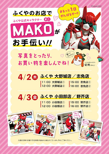 ふくやのお店でMAKOがお手伝い!! 福岡を舞台とした本格特撮ヒーロー作品「ドゲンジャーズ」に登場する ふくや公式キャラクターMAKOが、ふくや志免店にやってきます! 【日時】 2026年4月2日(木) ①15:00 ②16:00 是非この機会に、MAKOと一緒に写真をとったり、お買い物をお楽しみください! ※交通状況等の影響で予定時間が前後する場合がございます。予めご了承ください。