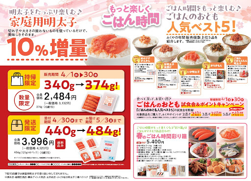 こんにちは!ふくや新宮店です☆彡 今回は4月1日から始まるイベントのご紹介です♬ 🌸もっと楽しく ごはん時間 🎉”春のごはんのおともフェア”開催!🎉 期間: 2026年4月1日㊌~4月30日㊍ 【企画その1】家族でたっぷり味わう!家庭用明太子10%増量キャンペーン✨ 通常340gのところ、キャンペーン期間中は374gで販売いたします。 【企画その2】ふくやのご飯のお供 "大試食会&ポイントキャンペーン⭐ 「ごはんのおとも!人気ベスト5」の試食会を開催いたします。 対象商品購入を2品購入以上で、お会計のふくやポイントが「2倍・3倍・5倍UP!」 (上限5倍まで) 【企画その3】春のお買い物抽選会!!🌟 期間中、税込3,000円お買い上げで1回抽選、当選者には “「500円分のふくやお買い物券」”をプレゼント🎁 【企画その4】ふくや春のカタログ掲載商品をお持ち帰りできる🚩 <春O'clocca掲載商品のおすすめ詰め合わせ> ① 春のごはん時間彩り箱 ② 明太子と春のスイーツ詰合せ ③ ごはんのおともベスト5詰合せ 「ふくやで大人気!ベスト5」の商品をご準備いたします。 💫などなど楽しいイベントが盛りだくさん!🚩 スタッフ一同みなさまのご来店をお待ちしております🏃♂️ ▼詳しくはこちら▼ https://www.fukuya.com/news/shop_spring_festival/ 大試食会はカレンダーをcheck✅