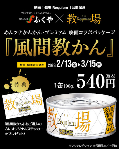 \映画「教場」×ふくやコラボ決定‼/ 2月20日公開の映画「教場」を記念して、 特別仕様の「風間教かん」が登場!! 購入特典として、オリジナルステッカーをプレゼント♪ 数量・期間限定につき、お早めに! 定価: 540 円(税込) ※写真はイメージです。 スタッフ一同、皆様のご来店を 心よりお待ちしております! ふくや天神地下街店 【営業時間】10:00~20:00