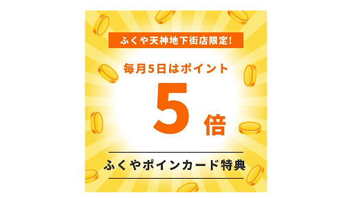★ふくや天神地下街店限定特典★ 🌟ポイントがお得にたまる🌟 ""ふくやポイント5倍”を 毎月5日に開催! ♦️新規会員募集中です♦️ スタッフ一同、皆様のご来店を 心よりお待ちしております! ふくや天神地下街店 【営業時間】10:00~20:00
